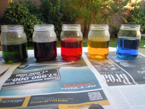 – Colorantes, en el supermercado venden en el pasillo de decoración de tortas una cajita donde vienen los tres colores básicos (amarillo, rojo, azul). Cuesta como mil pesos y duran mucho.