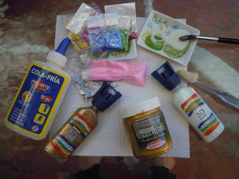 – Acrílico con glitter, yo tengo uno dorado y uno transparente, muy lindos y queda con harto relieve, los compré hace mucho tiempo así que no se cuanto cuestan, pero otra alternativa es usar lápices con glitter y pegamento.
