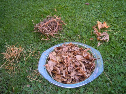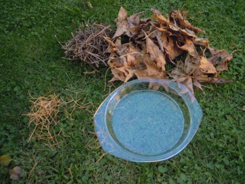 Descubrí que lo mas fácil, en vez de creerme pájaro y entrelazar las ramas, era poner un plato o fuente baja de vidrio y transparente y cubrirla con hojas y ramas. Así que solo necesitan un plato de vidrio, hojas secas y hartas ramitas.
