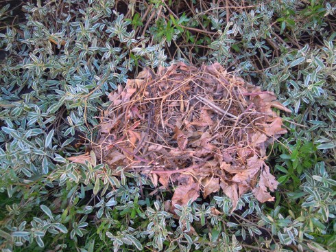Primero pongan la base de hojas, asegurándose de cubrir todo el plato de vidrio y luego cubran con las ramas. Asegúrense de hacer una especie de hoyo al medio, para que los huevos no queden por encima si no que mas bien adentro.