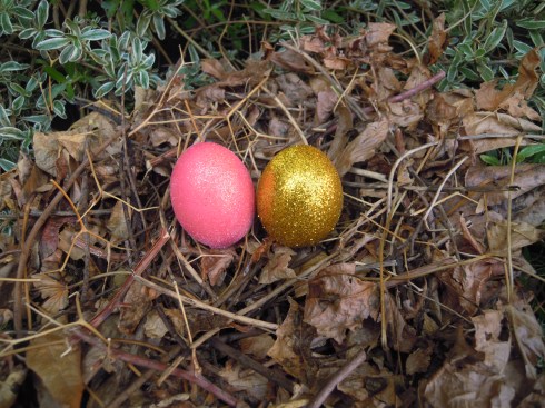 Lo único que tienen que hacer es pintar los huevitos con cola fría y espolvorear glitter encima. El huevito de la izquierda estaba teñido de rosado y el dorado estaba teñido de amarillo.