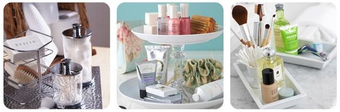 3. Si tienes un vanitorio con espacio donde dejar tus productos, pero compartes baño con más gente, una manera de seguir manteniendo todos los productos en el mismo lugar, pero siempre ordenados es ponerlos en platitos donde quepa todo o al menos lo más esencial, para ahorrar espacio puedes poner vasitos para tus brochas o cotonitos como se muestra en la imagen. Así evitas que quede todo desordenado o donde no corresponde (lo sé, soy enferma de maniática).