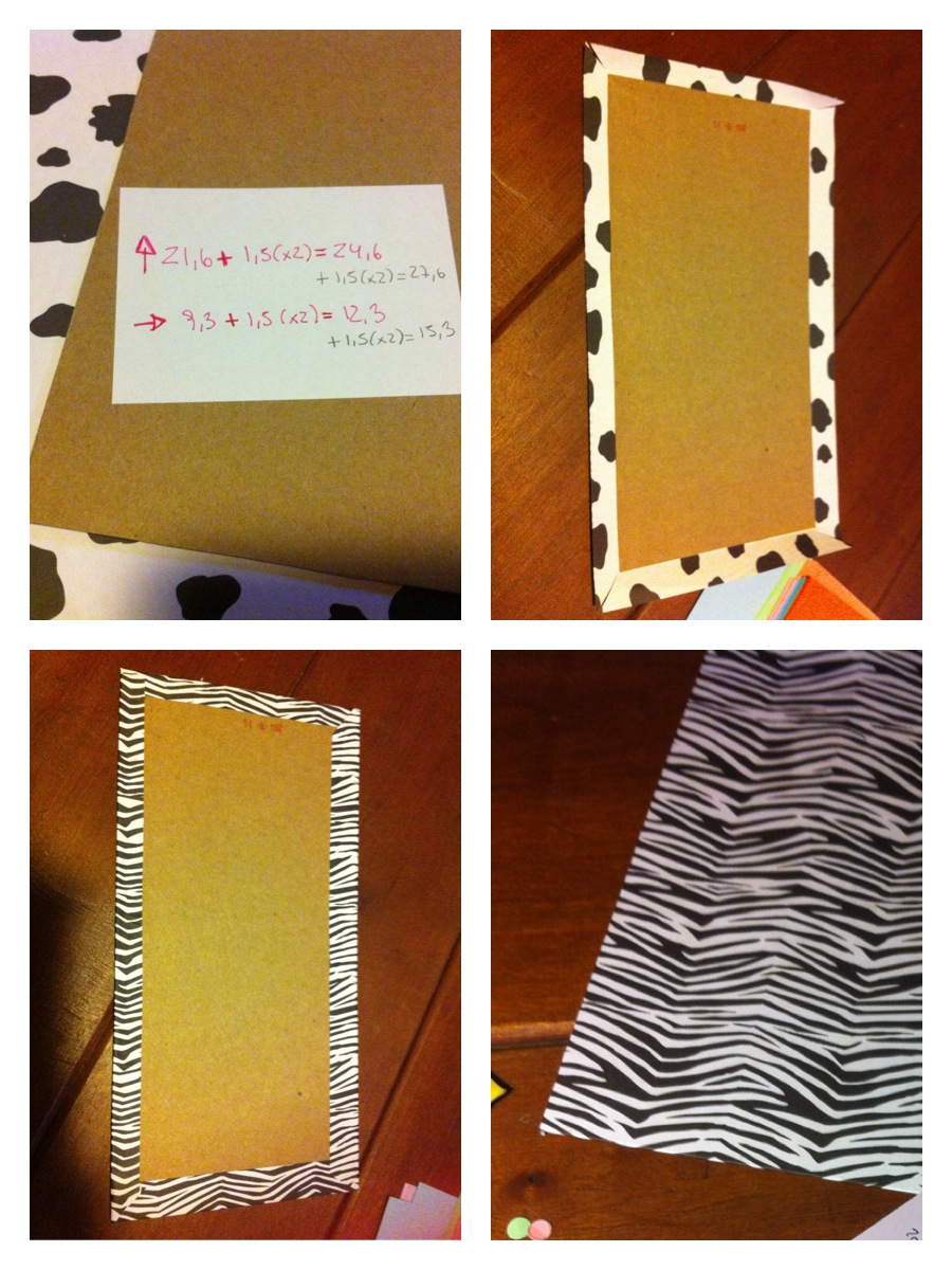 1. Ahora, para forrar el cartón, tomé el papel con diseño por el lado que no usaré, que en este caso es el de vaca y puse cerca del borde el cartón ya recortado. Y le dí 1,5 cm de margen hacia todos los lados y marqué con un lápiz mina para recortar el papel. Fíjense que al tomar la medida y antes de cortar, el papel tenga el diseño hacia el lado correcto. Si van a usar un papel de cebra por ejemplo, fíjense que las líneas de cebra quedarán horizontales y no verticales una vez que hayan recortado el papel.