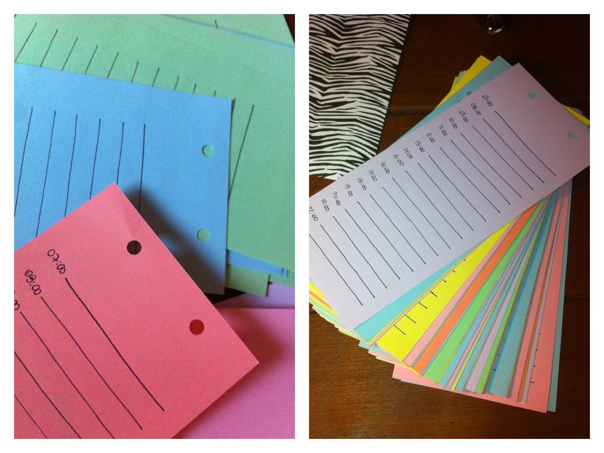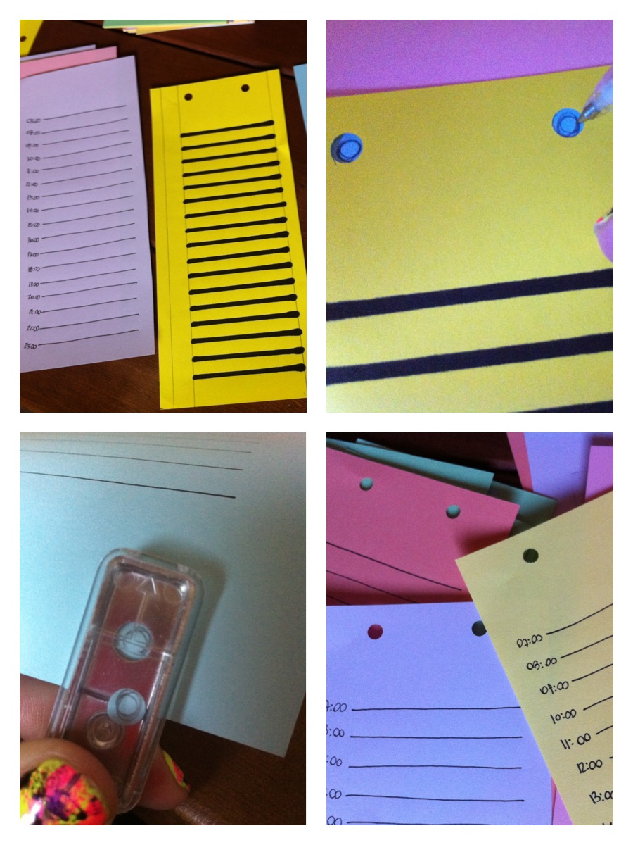– O hacerlo a mano. Yo prefiero hacerlo a mano porque encuentro que queda más lindo y porque tenía tiempo para hacerlo. Lo que hice fue tomar otra hoja del mismo tamaño que las que recorté y hacer un margen hacia la izquierda y luego otro a la derecha. Al lado del margen de la izquierda dejé un espacio para anotar las horas. Hice líneas horizontales con 1 cm de separación con la regla y luego marqué las líneas con un plumón para poder poner esa hoja por debajo de las demás y marcar las líneas. Hice las líneas a mano siguiendo la plantilla que tenía por debajo, es súper fácil de hacer aunque toma algo de tiempo y hay que tener buena luz. Las hojas verdes y azules tuve que hacerlas a contraluz, en la ventana cuando estaba de día, si hubiese hecho esto de noche habría usado una mesa de centro con vidrio y hubiese puesto una vela por debajo para que se transluzca.