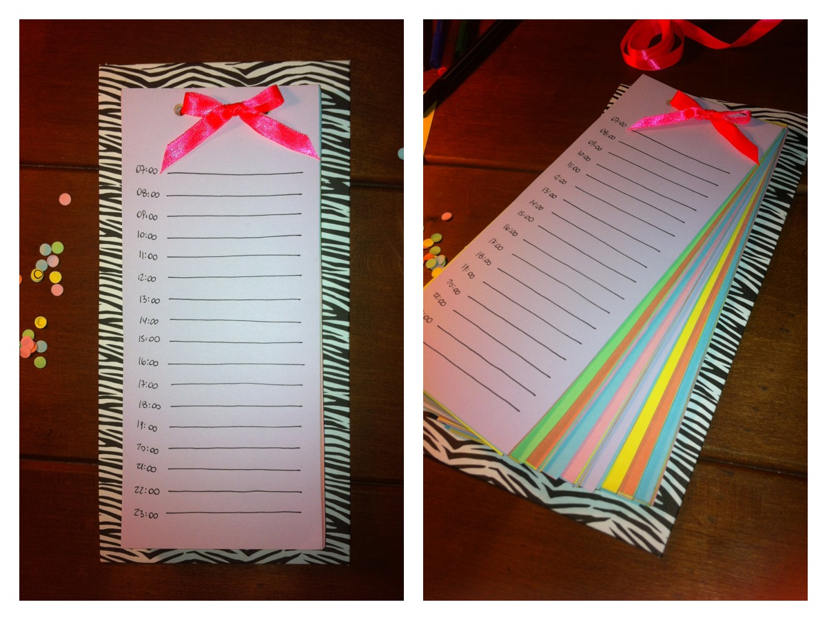 6. Y listo! Ahora pueden pegar su organizador en la pared. Cuando se acabe el día pueden simplemente tirar la hoja y botarla o guardarla como registro si quieren. E ir amarrando nuevamente la cinta para que las hojas estén siempre bien sujetas.