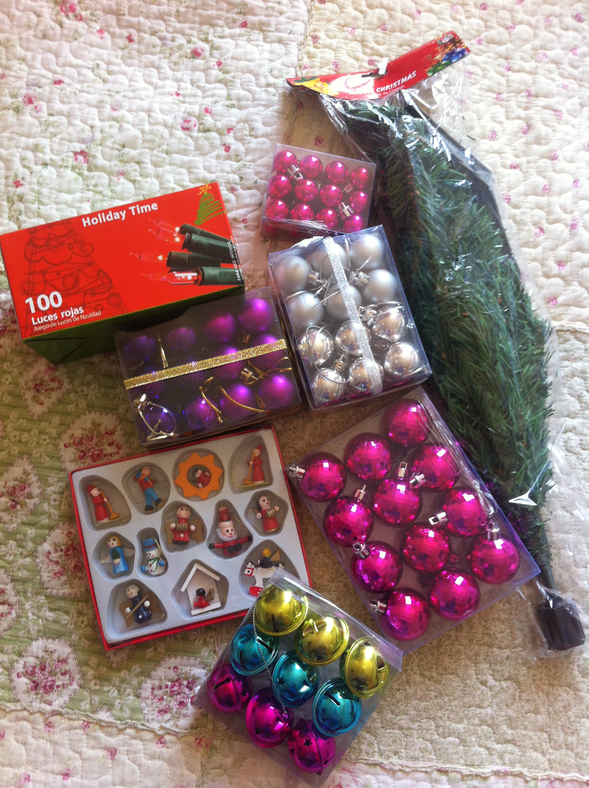 Ya, ahí están algunas cosas que me compré esa mañana, esas esferas rosadas diminutas también las compré en el Lider a luca. Y como guirnalda para el árbol compré una tira de 2 mts de lentejuelas rosadas en una cordonería, para que mi árbol se vea siempre topísimo.