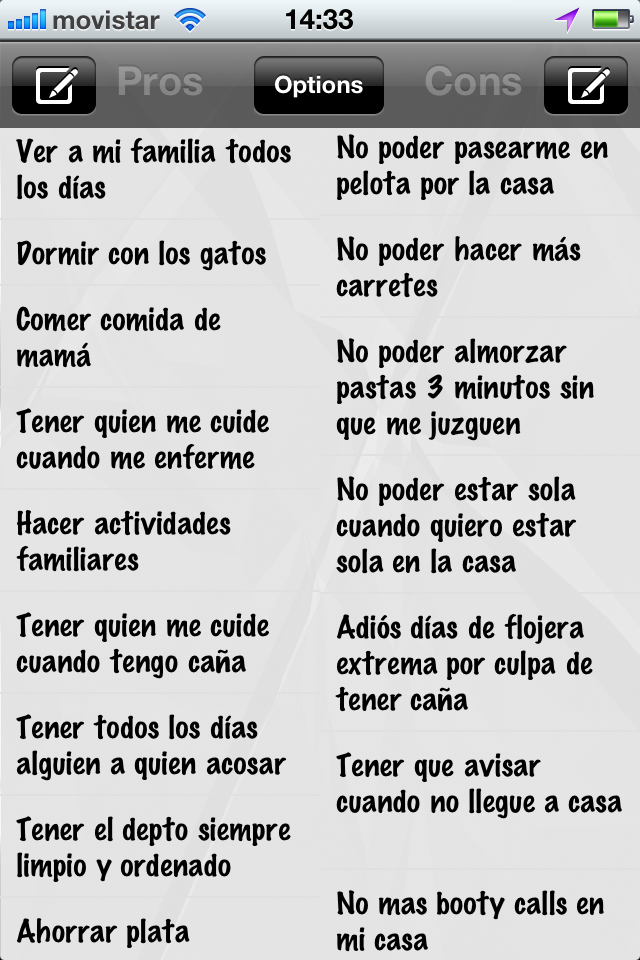Es una app super tchori que se llama Pros & Cons, tu anotas en un lado los pro y los contras así como también eliges que nivel de importancia tiene cada uno y la app calcula si tiene un mayor porcentaje de pros o de contras. Esta lista tiene un 60% de pros y 40% de contras. Nada de mal creo yo.
