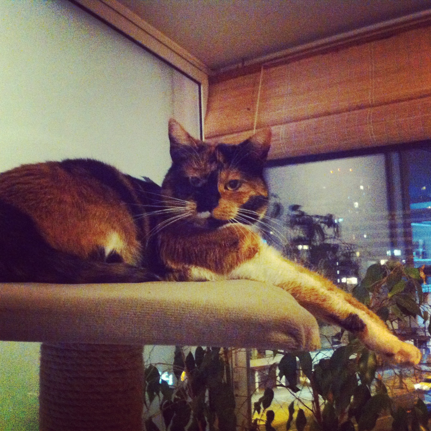 this is funnyDía #11. This is funny. Esto es muy divertido. La Chofi en una posición muy elegante en su árbol de gato. Linda preciosa, le amo.