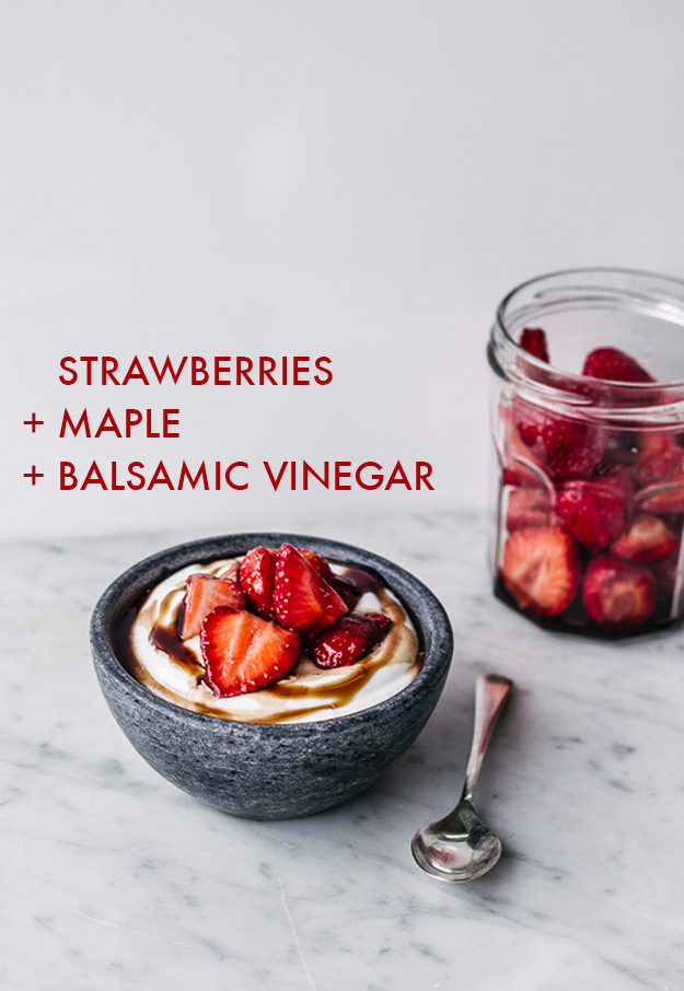 Frutillas + Jarabe de Arce + Vinagre Balsámicoyogurt y frutillas y balsamico
