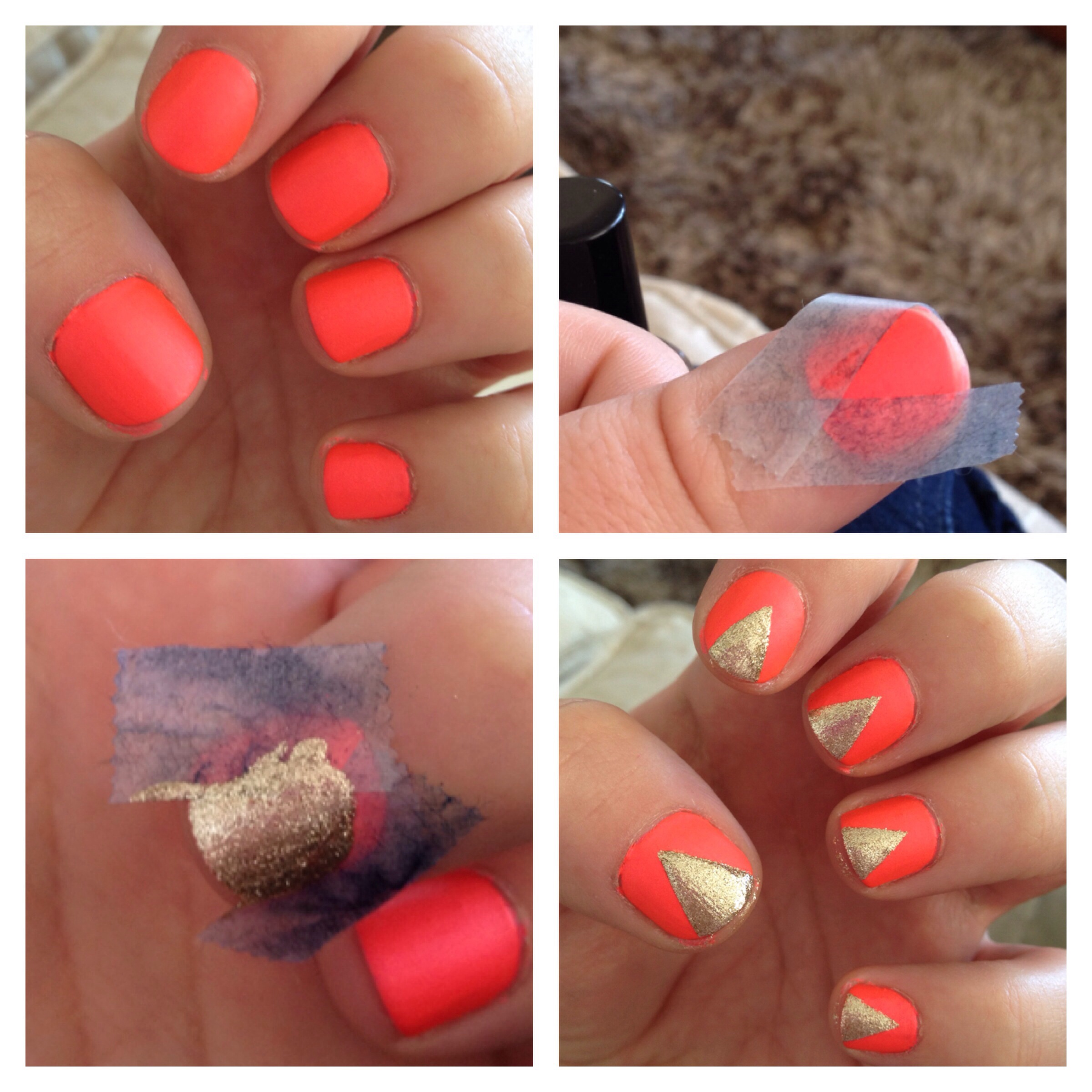 5. Repetir en todas las uñas hasta terminar. Luego limpiar el exceso de esmalte y si quieren aplicar una capa de top coat. Yo no lo hice porque como el coral queda mate encuentro que hace un lindo contraste con el dorado.