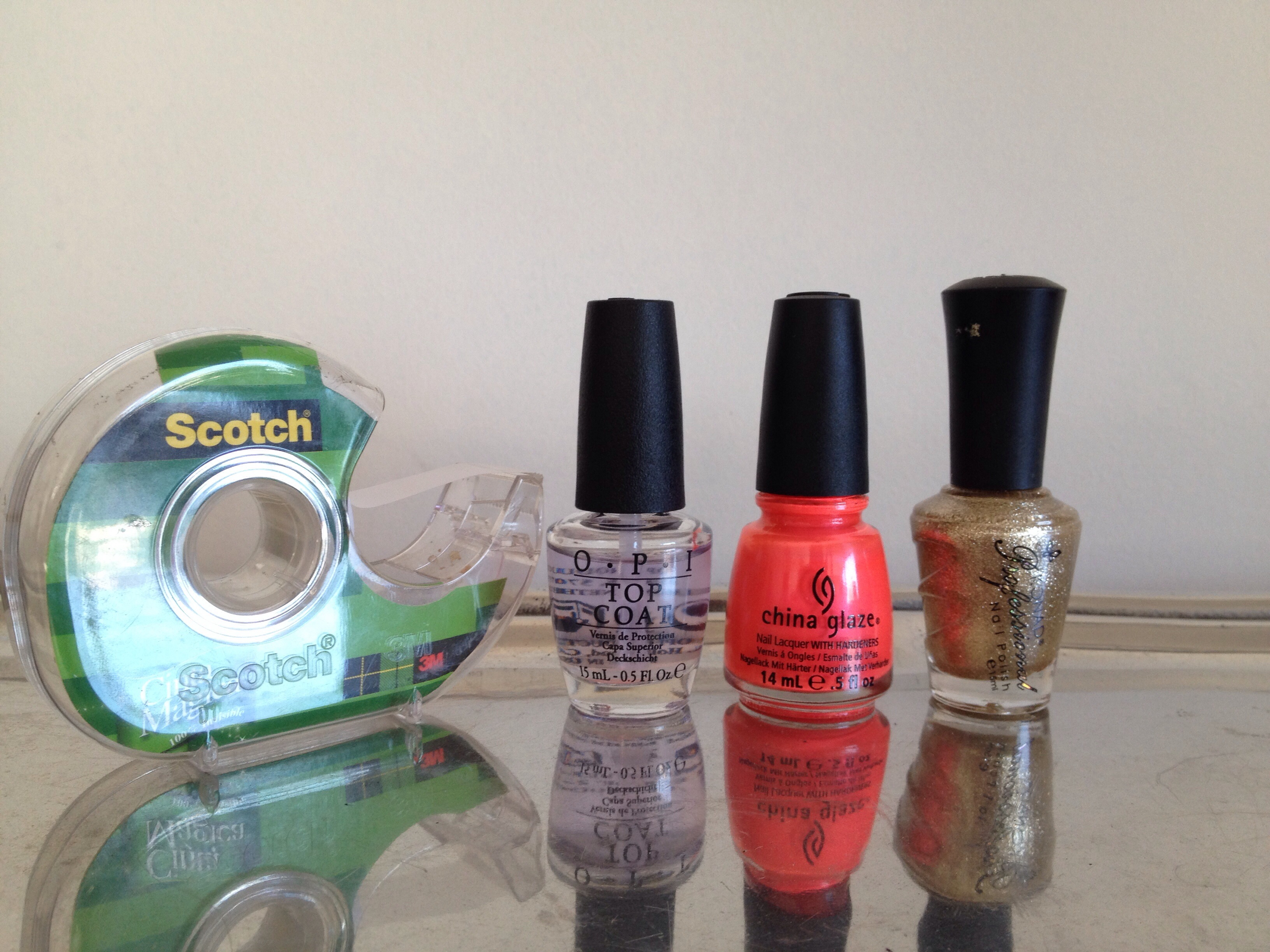 - Scotch, yo usé ese que es opaco porque tiene menos pegamento. De todas maneras mis tres consejos para cuando se hagan diseños con scotch son siempre gastar el scotch en la ropa para que pierda el pegamento. Ojalá esperar varias horas después de haberse pintado las uñas del color base (idealmente al día siguiente) y hacer uña por uña y siempre retirar el scotch inmediatamente, ya que si el esmalte que apliquen encima se seca, les va a quedar la embarrá.