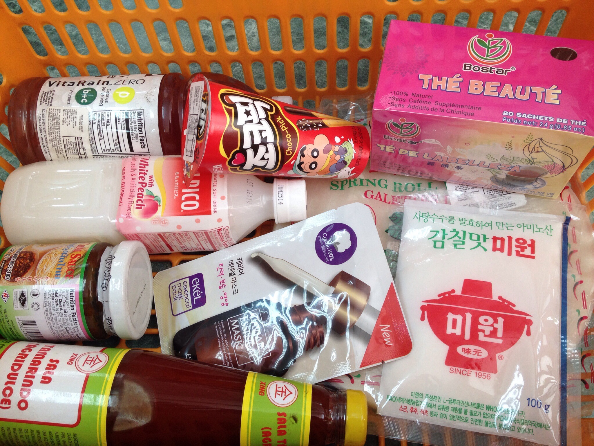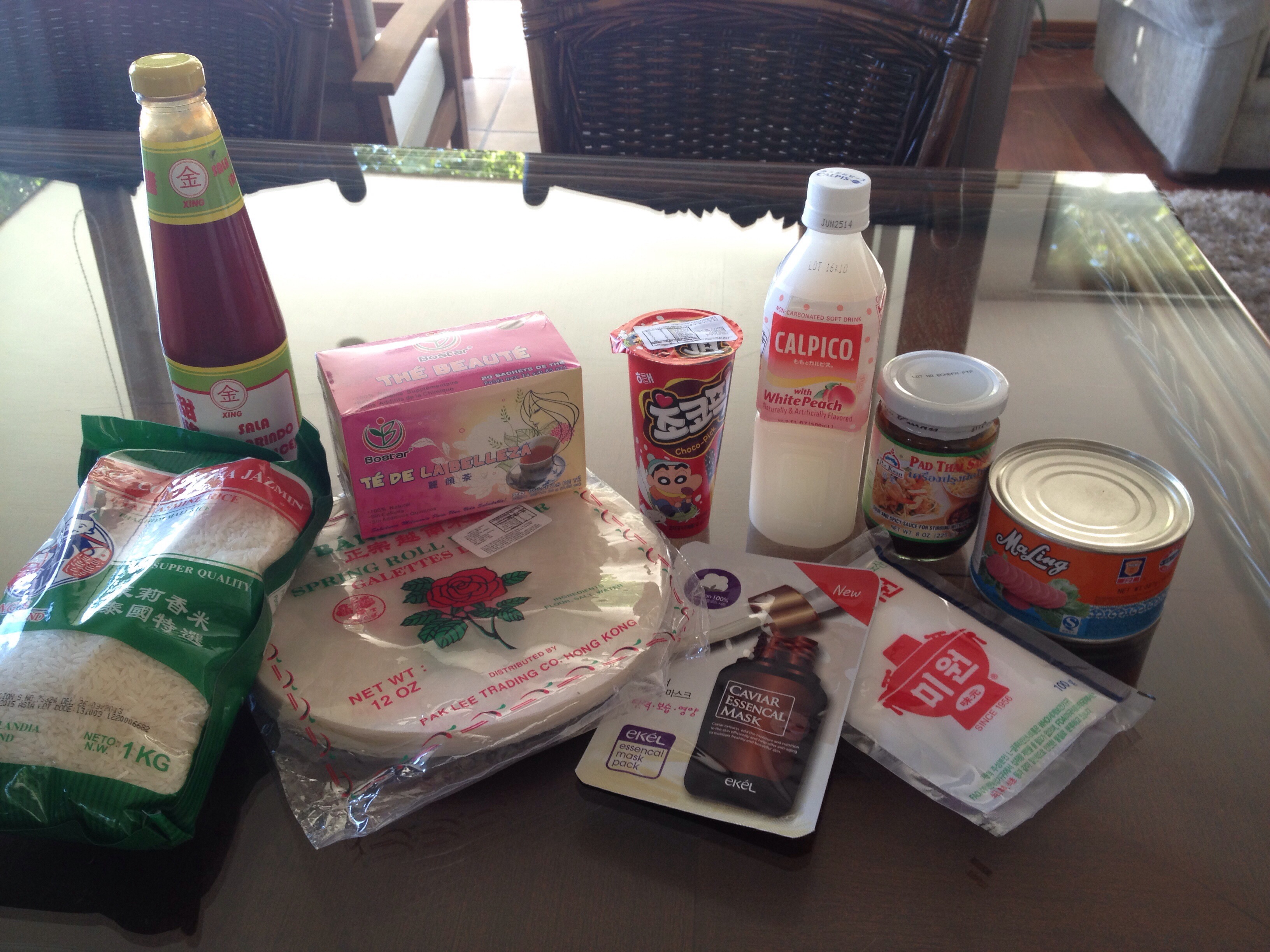 Esto fue todo lo que compramos en el Assimarket. Arroz de Jasmín, salsa tamarindo, té de la belleza, Yan Yan, Calpico de durazno blanco, una pasta de pad thai, chancho chino haha esa cuestión no la pruebo ni loca. Pero mi mamá dijo que había ene de eso en la época de la Unión Popular y que era súper rico. Así que invitó a su hermano, mi padrino, a almorzar y se mega emocionó cuando le conté que había chancho chino, me encanta el nombre.