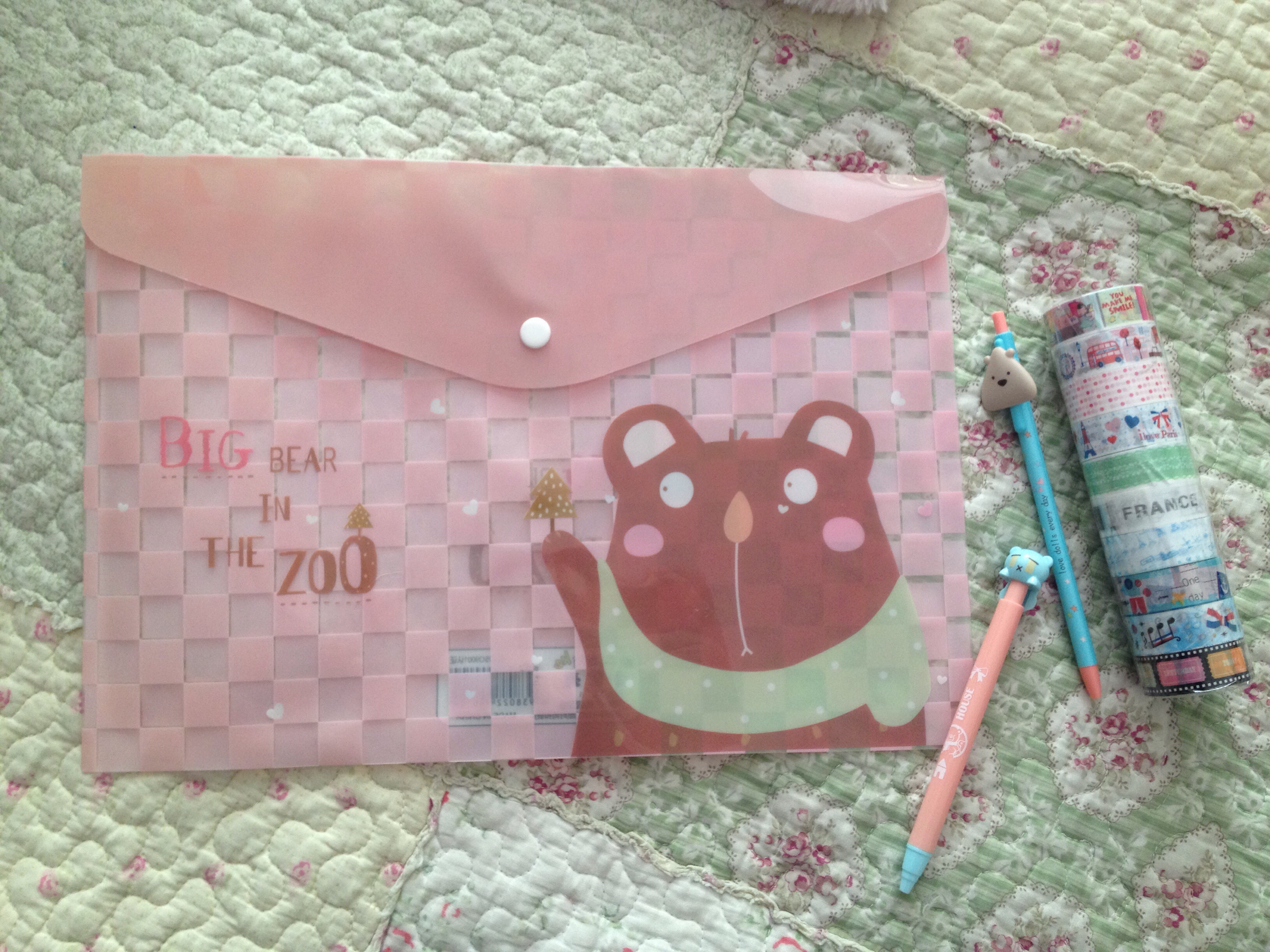 Después me fui a un lugar que pensé que me haría sentir mejor, My Fantasy. En verdá ese lugar la lleva. Pero tampoco encontré stickers para planificador o washi tapes.Que a todo esto busqué y busqué y no encontré nada…..que fome. Pero si encontré una carpeta muy linda que me va a servir para guardar papeles cuando esté lloviendo. Unos scotch con diseños muy lindos y dos lápices.