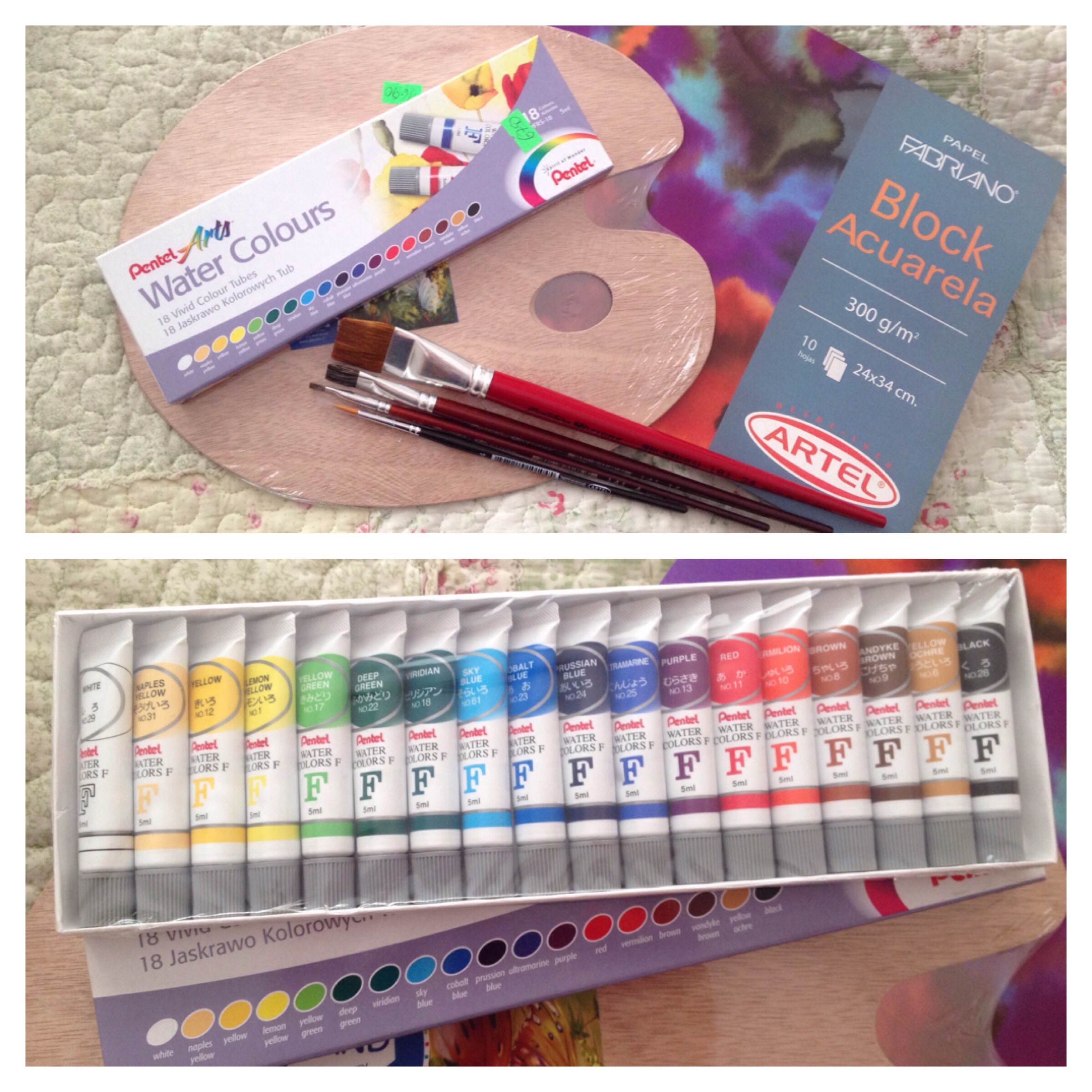 Lo bueno es que no fue un viaje perdido porque justo pasé por Mundo Artesano, que es lo máximo y encontré acuarelas en tubo, algo que había estado buscando hace días sin tener mucha suerte. Así que aproveché de comprarlas ahí junto con la paleta, algunos pinceles y el block. Este último no les quedaba así que lo compré en la Librería Mike, que queda casi al frente.