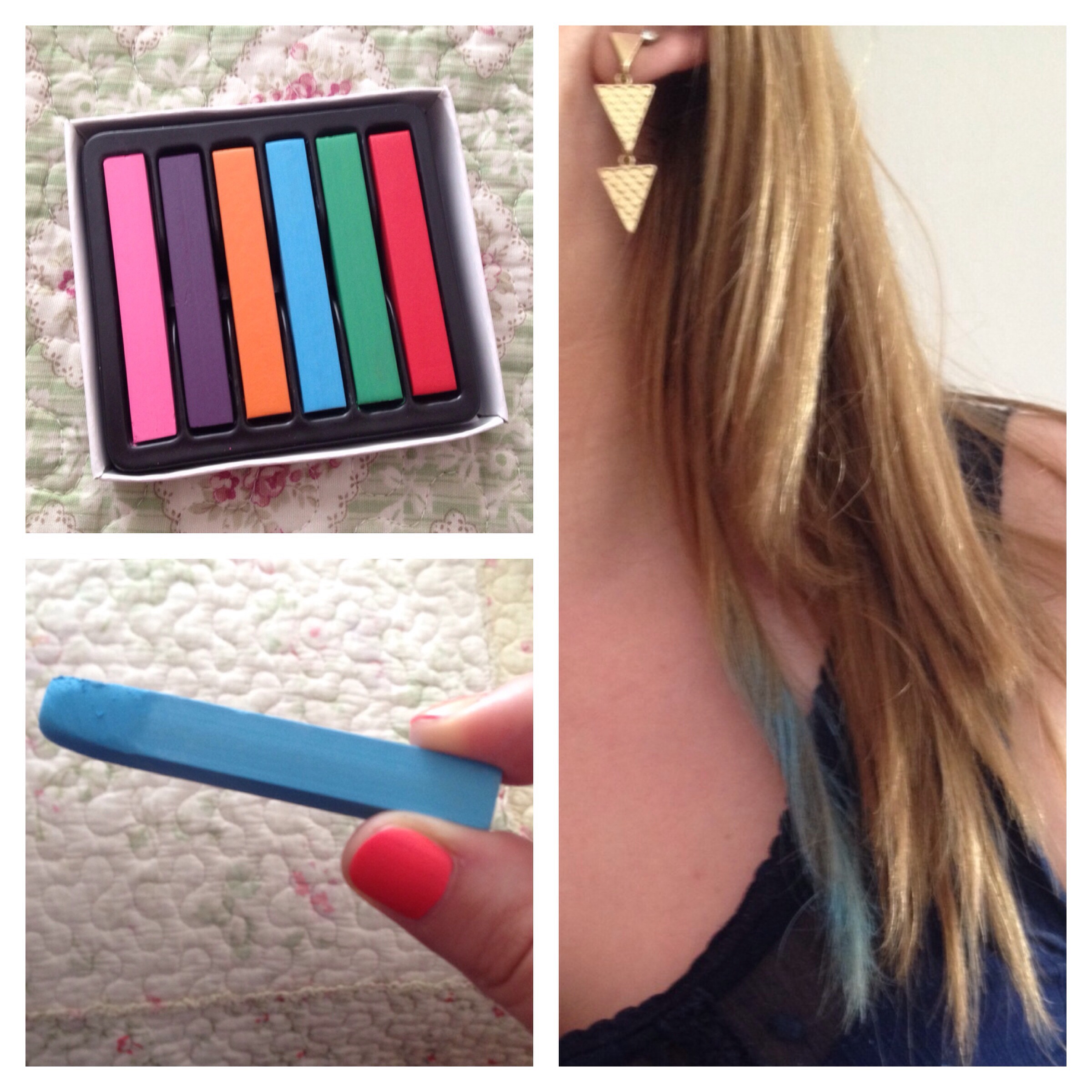 20140403-005512.jpgY la mejor compra del día, es que me encantaaaaa. Encontré en el Chica’s Chic unas tizas para teñir las puntas del pelo. Yeiiii. Y lo más bacán es que me costaron $2.990. Son 6 colores y se aplican con mucha facilidad. Lo ideal es aplicar un poco de laca en el pelo para que dure más. Luego mojas un poco la barrita y te pintas el pelo. Lo que más me gusta es que se sale con el lavado, incluso yo diría que se sale antes. Yo me pinté ayer un mechón de pelo para probar que tal y un par de horas después el color era menos intenso. Hoy en la mañana ya se notaba poco pero se veía igual. Así que es como para ocasiones muy especiales y yo diría que te gastas la barra entera de una sola vez. Ah! Y yo tendría cuidado con las sábanas y la ropa, demás que se sale todo con el lavado pero igual…..aparte de eso yo diría que es muy fácil y práctico.