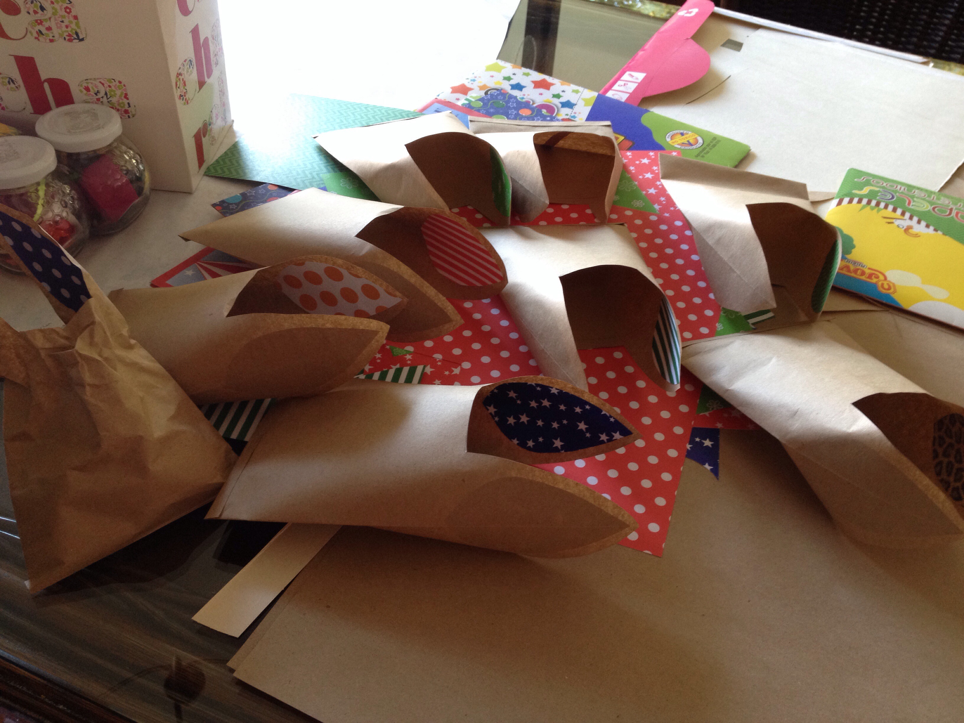 35. Les recomiendo usar bastante pegamento y dejarlo secar un poco. Lo que yo hice fue pegar bien cada oreja y dejar la bolsa abierta para que se afirmen bien las orejas y después no salgan volando. Si usan un papel más delgado del que usé yo es muy probable que no tengan que ser tan cuidadosas, pero igual usen bastante pegamento para que les dure la cuestión.