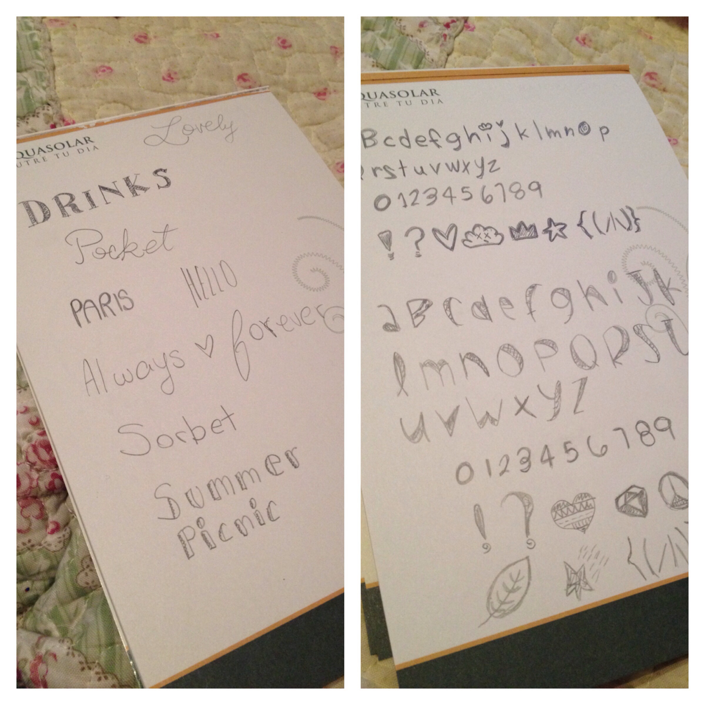 Incluso estuve practicando caligrafía, eso me entretuvo bastante durante la tarde y me relajó mucho. Partí con cosas un poco más sencillas, pero de a poco espero ir poniéndome más seca. Las letras las saqué algunas de Pinterest, de un tablero que hice de caligrafía, y otras las saqué de una página muy buena que tiene miles de tipos de letras. Pueden verla aquí.