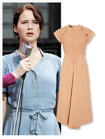 El vestido de seda en color damasco, cuesta US$5.000 y se encuentra disponible en net-a-porter.com, donde además hay otros vestidos inspirados en Katniss por precios mas bajos.