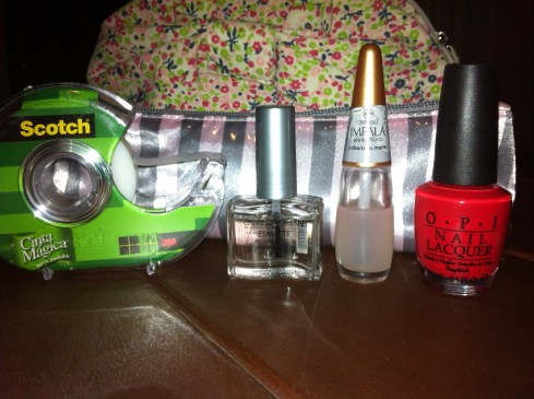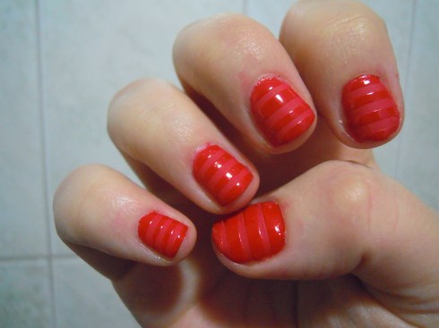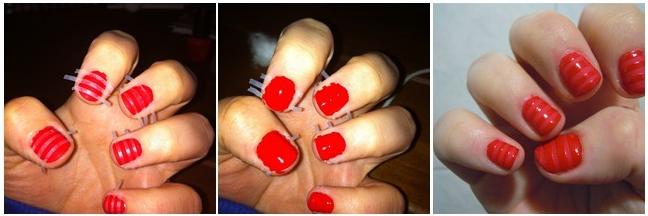 1. Luego de pintar las uñas de rojo mate, como se muestra en el paso a paso anterior, gastar el scotch en las manos o ropa y cortar tiras de mas o menos el mismo grosor y ponerlas aproximadamente a la misma altura.