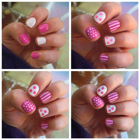 1. Luego de aplicar el esmalte transparente, pinta tus uñas blancas y rosadas, intercalando. Aplica dos capas.