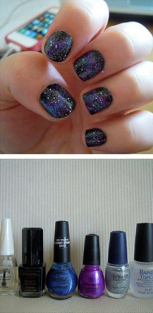 2. Esto es lo que necesitarán: Un esmalte de base, esmalte de uñas negro o cualquier otro color oscuro que represente el espacio exterior. Esmalte de uñas con glitter: Azul y Violeta, yo usé Me+blue, de O.P.I. y Flying Dragon, de China Glaze. Esmalte de uñas plateado con glitter, yo usé Ice Aurora, de Konad Nail. Me gusta este porque tiene pequeñas y grandes manchas de glitter, parecido a las estrellas. Un esmalte de cobertura para brillo extra y protección. Yo usé el Rapid Dry Top Coat, de O.P.I. Y una esponja para base de maquillaje, las que tienen forma rectangular funcionan mejor.