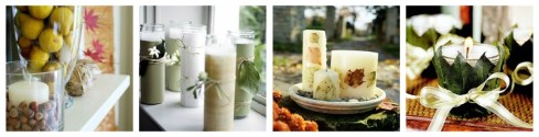 13. Si tienes velas largas lo ideal es cubrirlas con un papel lindo, que tenga los colores de la naturaleza y atar rafia o cinta de los mismos tonos, puedes agregar alguna decoración floral o algún piñón, etc.
