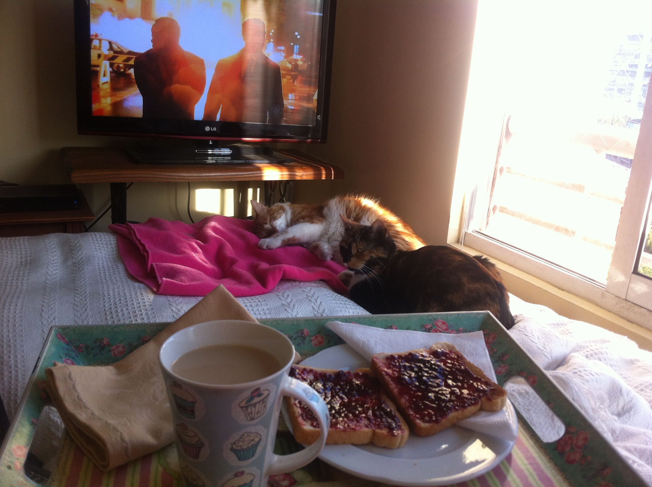 Que fomito, esto significa que no voy a poder carretear el fin de semana. Ahg!!Me cargaaaaa. Pero como pueden ver, estoy muy bien acompañada en camita, tomando desayuno preparado por mami. Que grande es la diferencia entre mis resfríos del año pasado y los de ahora. Porque tengo quien me cuide y me encanta.