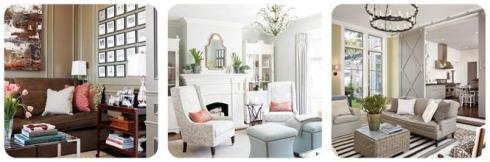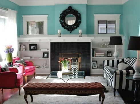 3. Por lo general, un living donde todos los colores sean parecidos, tiende a verse aburrido. Pero si tienes un juego de sillones iguales o del mismo tono y te gusta tanto el color que quieres pintar tus muros también así, entonces te recomiendo jugar con las texturas, poner cojines satinados o con algo de brillo, objetos que llamen mucho la atención, el dorado va muy lindo con este color medio verde agua. Es un estilo un poco anticuado, pero que no deja de ser usado y si está bien decorado, puede verse maravilloso.