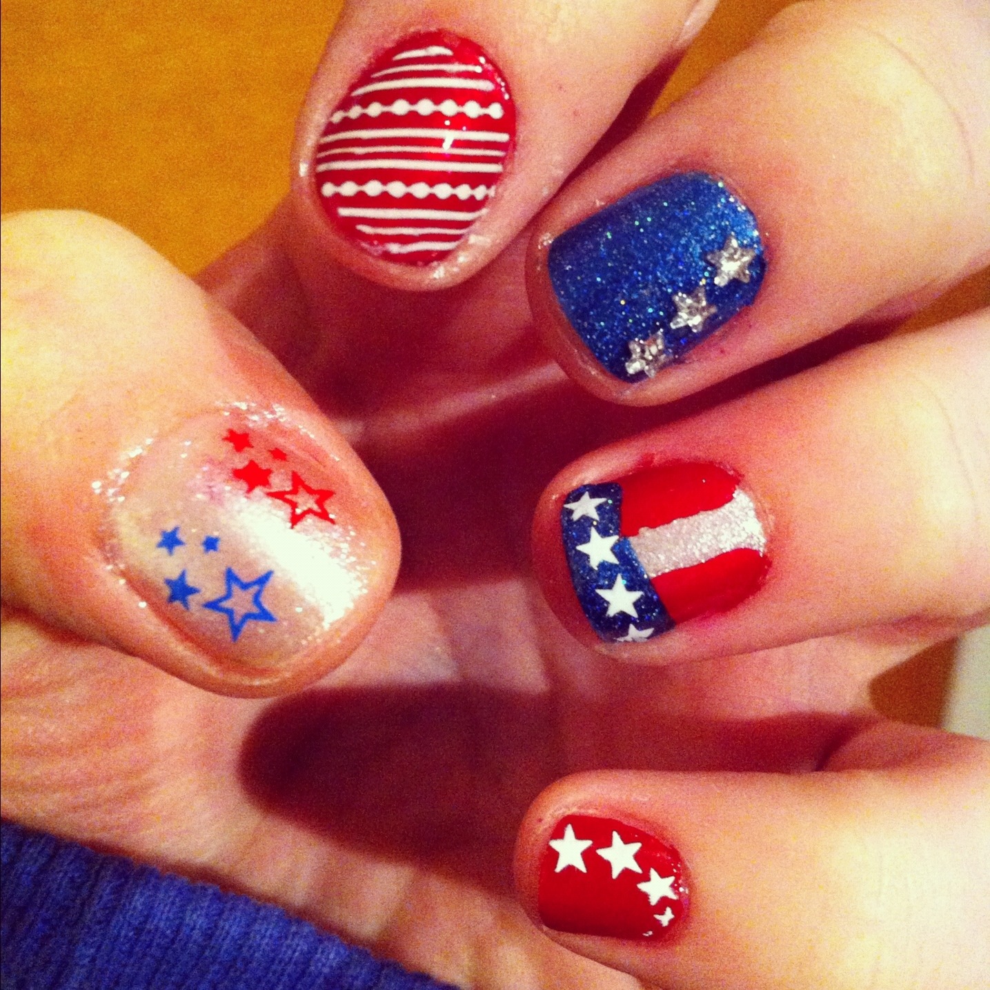 Perdón que al final no les conté nada sobre mi celebración del 4 de Julio, pero les diré que lo pasé increíble y que llegué a mi casa el 5 julio en la tarde, así de bueno estuvo el carrete. Y obvio que me pinté las uñas de acuerdo a la ocasión, algunas de ustedes las vieron en mi Instagram (@milapuntocom), pero aquí dejo la foto para quienes no las vieron: