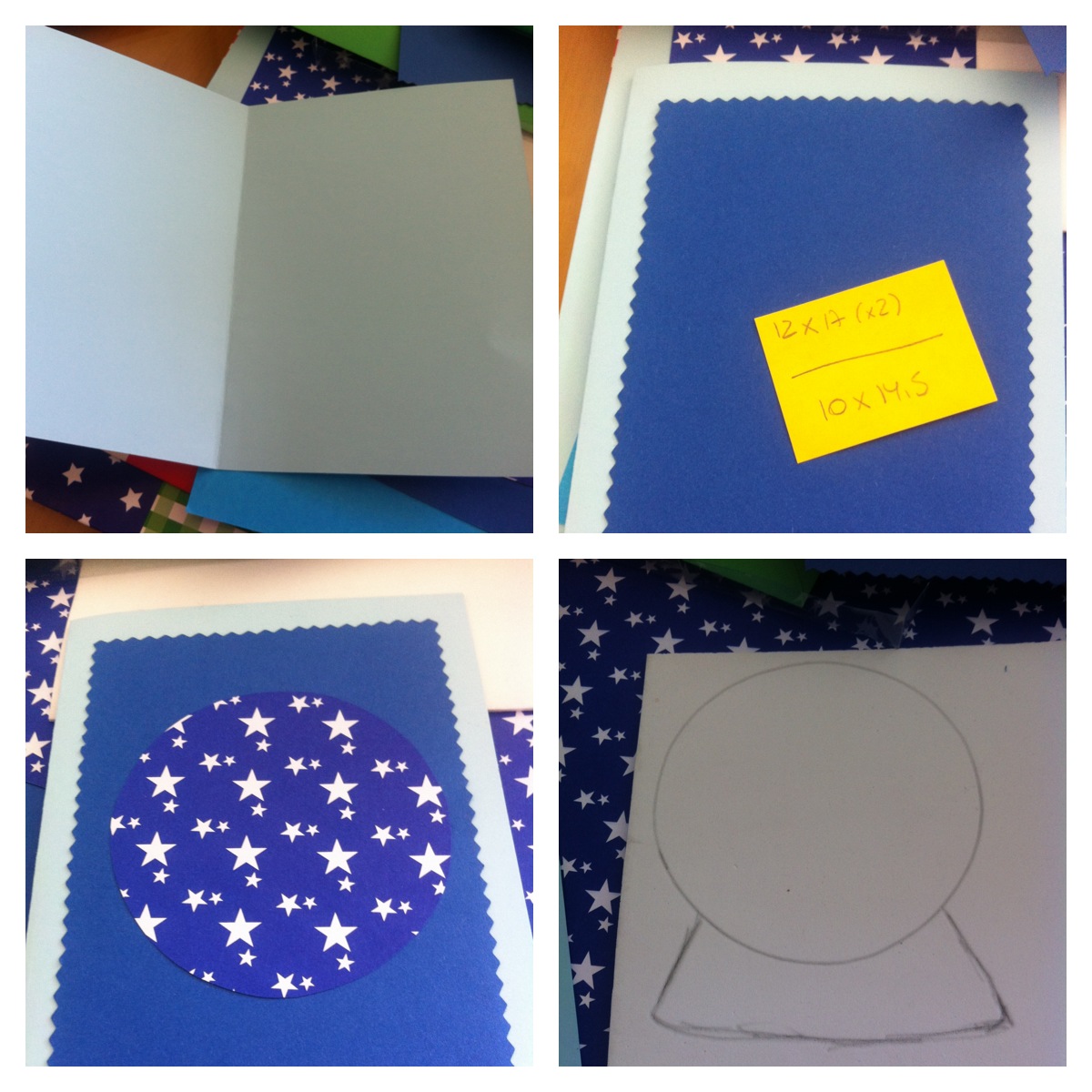 3. Cortar un círculo de papel azul con diseño, que quepa dentro del papel azul normal