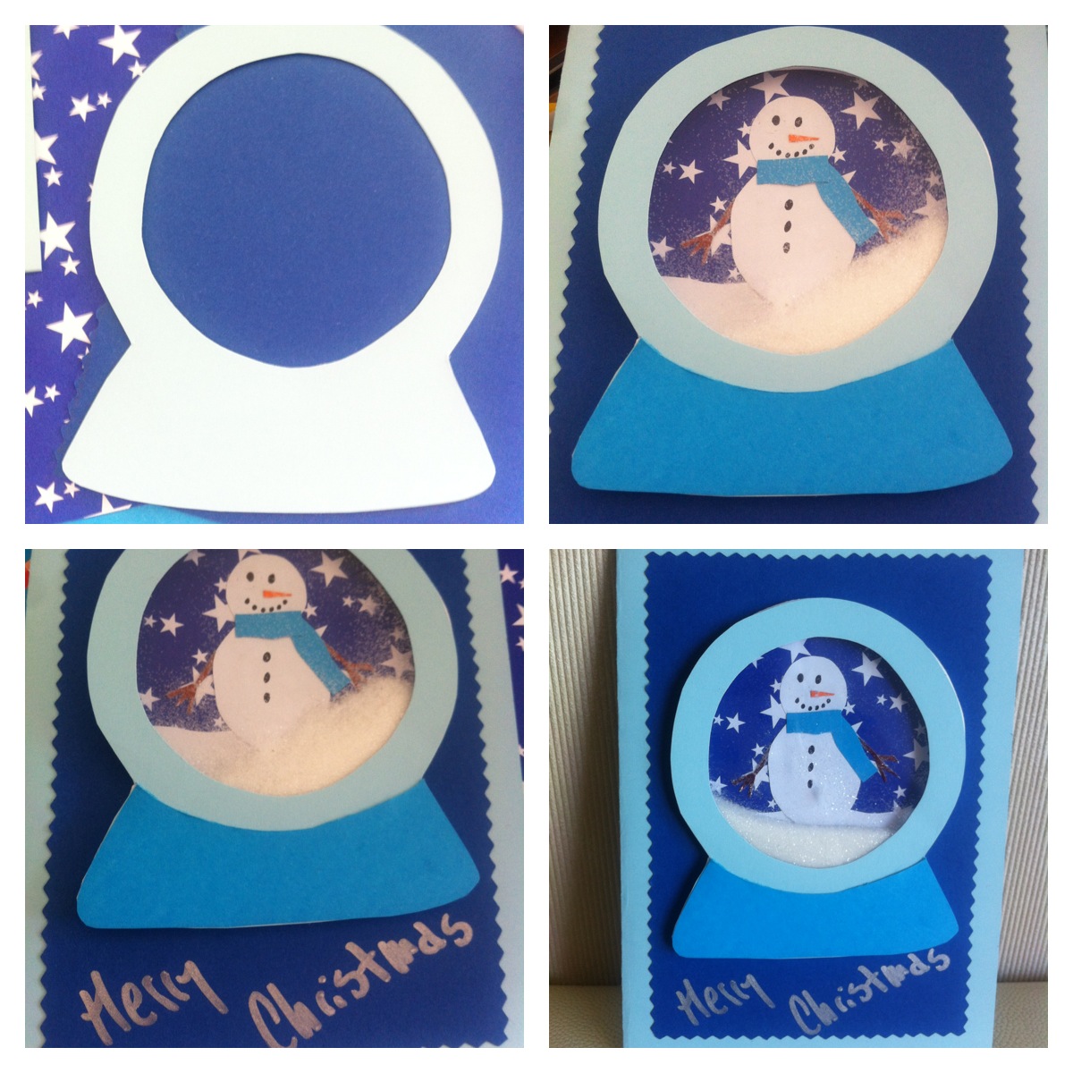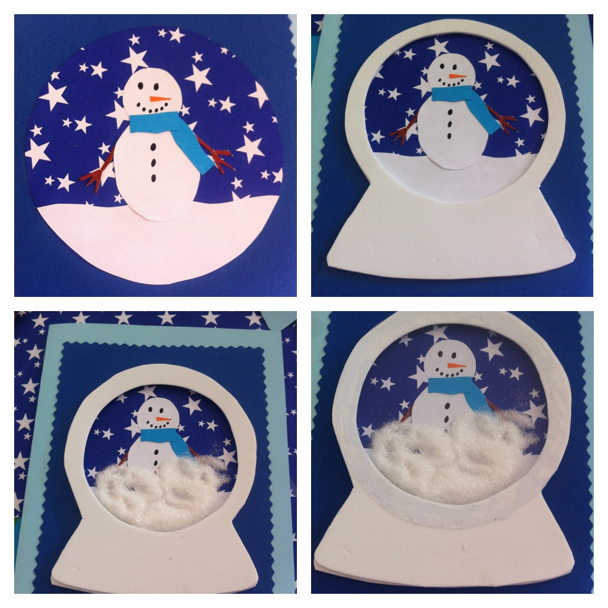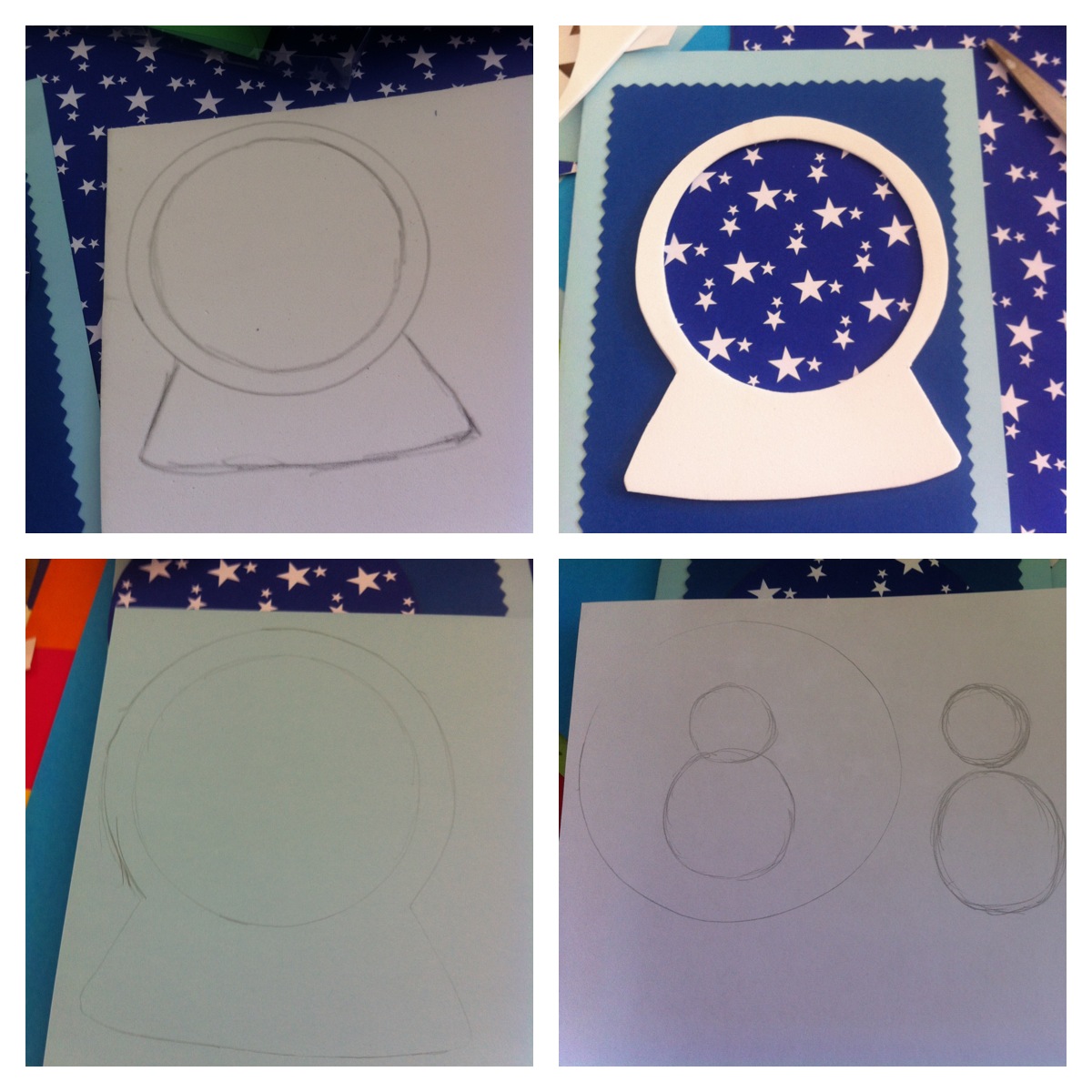 13. Ahora a cubrir la goma eva. Pegar encima el papel celeste, pero antes marcar y cortar con celeste más oscuro, una base para el globo de nieve.