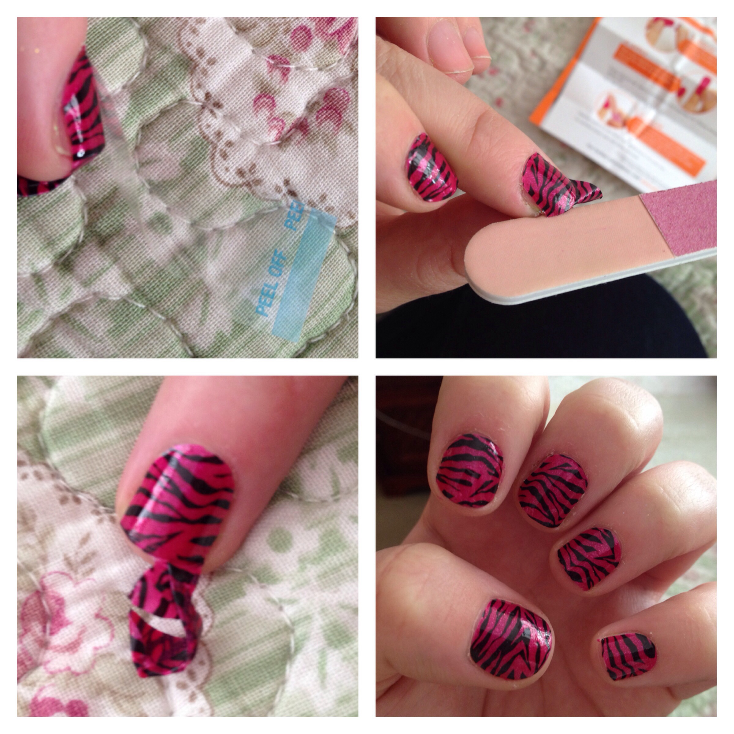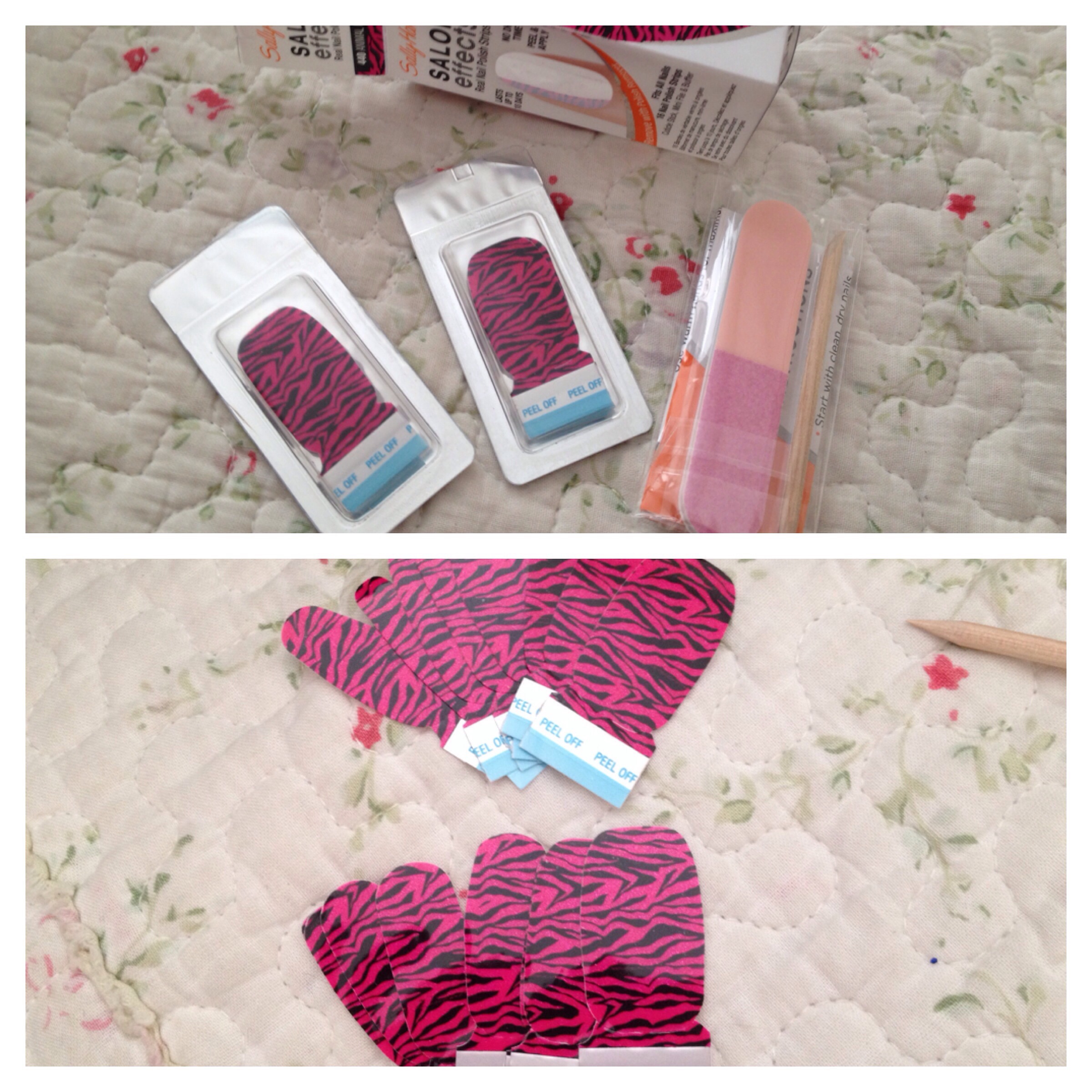 Así que lo primero que se recomienda es limar las uñas, luego suavizarlas con la parte blanca de la lima, echar las cutículas para atrás con el palito y pasar quitaesmalte por las uñas antes de aplicar los stickers, ya que tienen que estar completamente limpias y secas para que la manicure dure lo más posible.