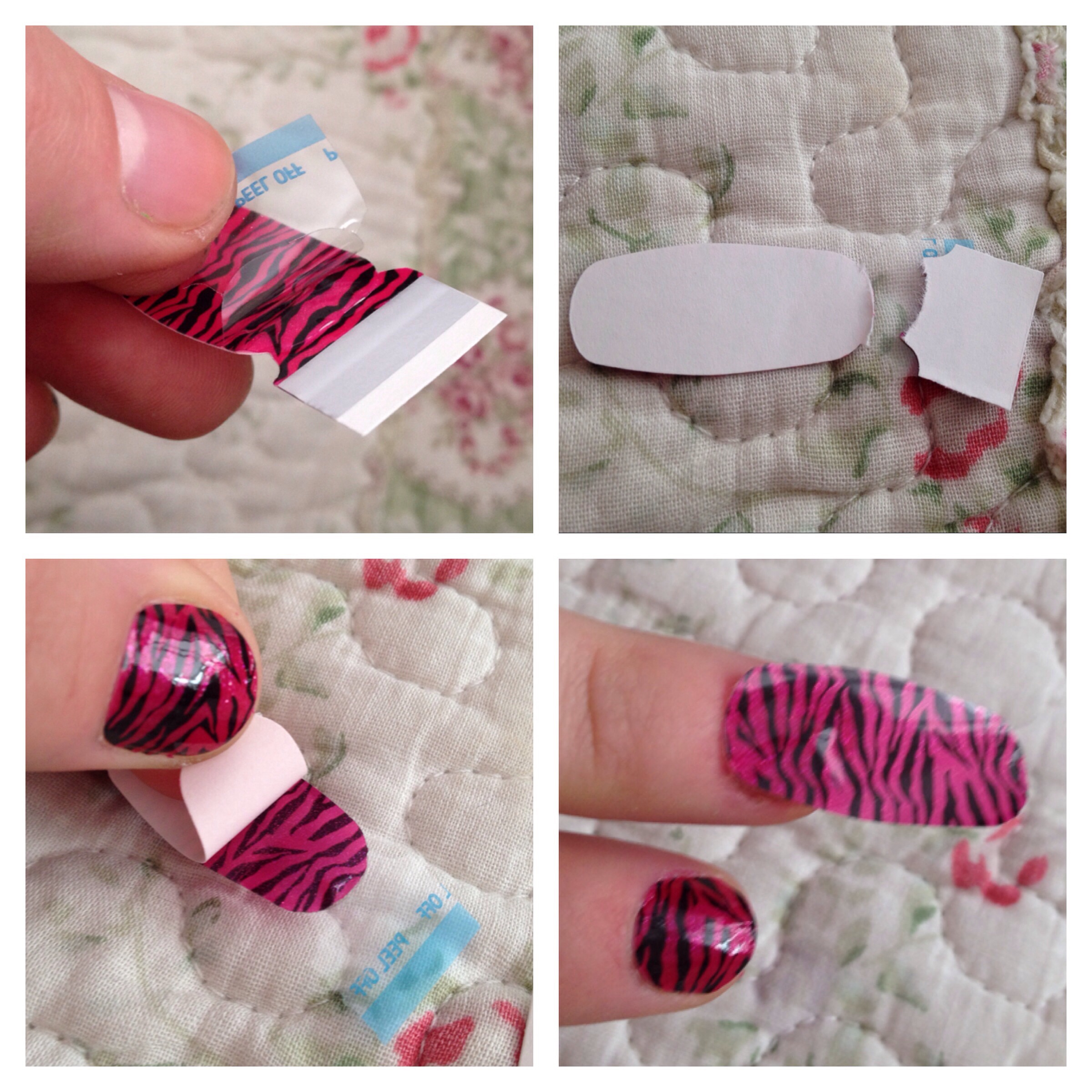 4. Pegar el sticker sobre la uña, hay que hacerlo con cuidado porque cuesta sacarlo una vez que ya lo pusieron. Se recomienda presionarlo desde el centro. Y luego retirar el sticker transparente.