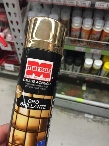 Todos estos frascos de mermelada los pinté con dos capas de spray dorado. Yo usé éste, que compré en el Easy: