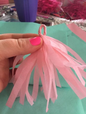 Pero en fin, les cuento que para 1,50 mt van a necesitar cuatro pliegos de papel volantín (o papel dorado metálico). Yo usé un pliego de rosado, fucsia, turquesa y dorado. Un hilo para colgar los tassels, hilos de colores para amarrar los tassels, idealmente que sean del mismo color de papel que van a usar, o uno que combine bien. Para el papel dorado metálico, elegí usar alambre dorado que funciona mucho mejor. Tijeras para papel y tijeras para hilo.