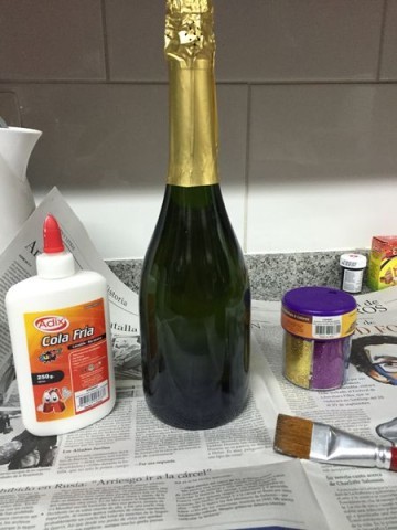 Lo único que van a necesitar es una botella de champaña limpia, sin etiquetas. Yo a las botellas les saqué la etiqueta mojándolas y luego raspándolas con una virutilla de esas para las ollas. Me tomó un poco de tiempo, pero nada terrible. Lo mismo hice con unos frascos de mermelada que usé para pintar de dorado y usar como floreros. También usen colafría (u otro pegamento de mejor calidad, porque al sujetar las botellas para abrirlas se salió toda la cuestión. Pero si son para decorar un rato está bien). Y un pincel y glitter. Lo que ven en la foto es casi todo el glitter que usé, incluso me sobró un poco.