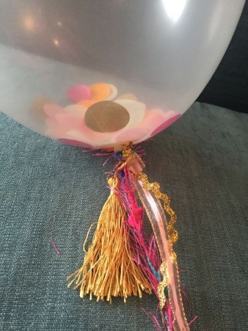 A los globos les metí un poco de confetti y los inflé. Negrini estaba hiponitzada viendo cómo volaban todos los papelitos adentro del globo cuando los inflaba hehe. Luego les puse cintitas y de esas lanas preciosas que tengo guardadas hace años. Me las regaló una amiga de mi mamá cuando cumplí como 22 años, una cosa así…y las guardé por mucho tiempo pero de a poco las he ido usando en distintas cosas. Amarré las cintas con más alambre metálico dorado.