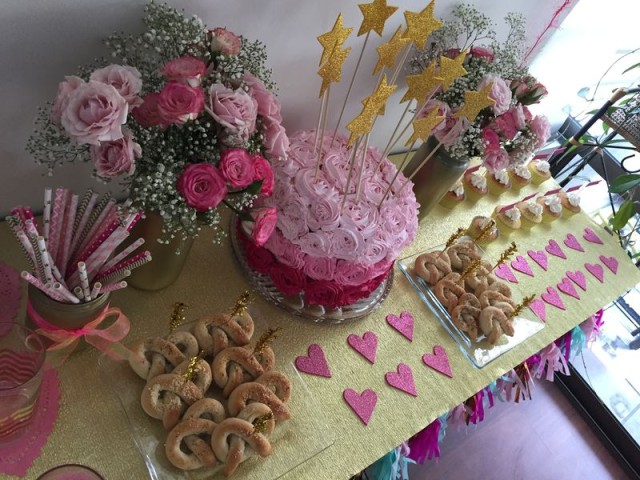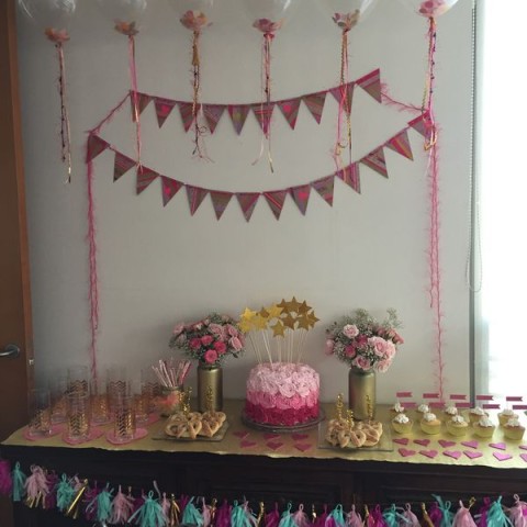 Hice un banderín de papel crepé dorado y cartulina española rosada, lo pegué todo con cinta doble contacto y con un lápiz de tinta dorada escribí «Gracias por venir» para mis invitados.
