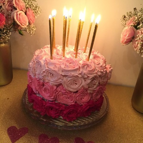 La torta la decoré con la misma crema y boquilla y colorante que mostré en la receta de los cupcakes. Me tomó menos tiempo del esperado, pero igual me pasó que se me iban cayendo algunas flores u otras no salían taaan bien. Por suerte logré hacer un lado lindo y el resto pasó piola hehe.