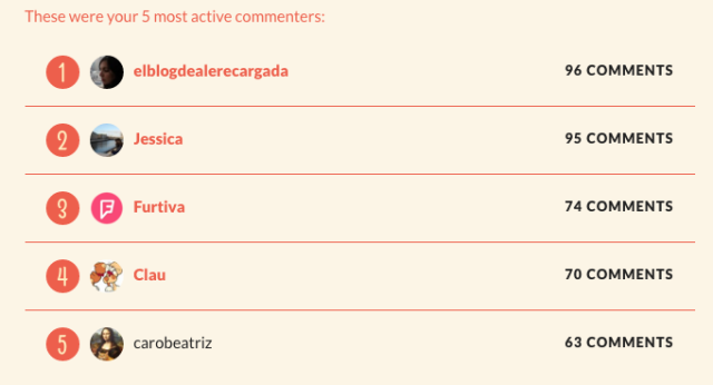 Así que felicidades chicas, las voy a contactar durante hoy para coordinar la entrega del premio. También le mando un beso a todas las demás lectoras fieles que aunque no están en el top 5 de las que más comentan, siempre me dejan comentarios ricos buena ondi que yo agradezco un montón. La verdad es que cuando hago concursos me es súper fácil reconocer quiénes son the real lectoras y quiénes son medio aparecidas haha, así que yo aprecio a toda la gente que a veces me comenta para darme un dato, para preguntarme algo de su interés donde yo pueda ayudarlas, para decir que probaron alguna receta, algún tutorial que compartí con ustedes, o simplemente para saludarme, es siempre muy lindo leerlas y aunque no siempre tengo tiempo de responderles a todas inmediatamente, me hace muy feliz comunicarme con ustedes y compartir cosas que espero sean de su interés.