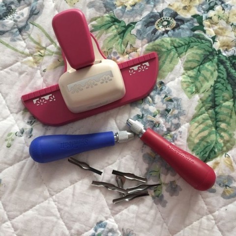 Mi perforadora de bordes y mis gubias, para tallar timbres. Son de la marca Speedball y las compré en la librería Color Animal.