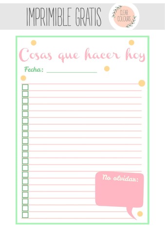 Pucha qué lindos los imprimibles y yo sin impresora, y aunque me hago una lista con cosas pendientes en hojas que ya no me sirven, la verdad es que no estaría nada de mal hacerlo en hojas lindas y coloridas. Se verían bien bonitas en mi pizarra en la oficina jajaj.