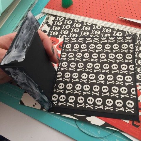 Pero antes voy a ver cómo decorarlo. Elegí un papel negro con calaveras para la parte de atrás y uno naranjo con puntos negros para la parte de adelante, donde ya sé que quiero poner esa mini escoba.