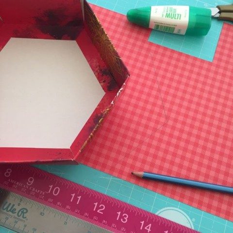Prueban si entra bien y si no, recortan un poco más para que entre ya que lo más probable es que les quede un poco grande el hexágono pero difícil que quede más chico. Yo pegué este papel con el pegamento líquido que les recomendé en la lista de materiales.