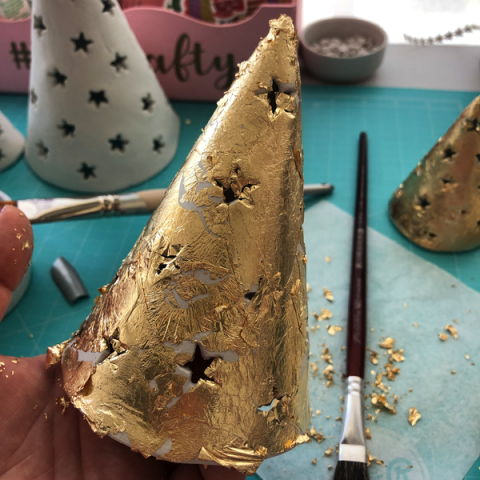 Luego si quieren, pueden pintar sus pinos con pintura acrílica (un dorado metálico quedaría hermoso) o pueden cubrirlos con pan de oro. Yo el mío lo compré hace años en Aliexpress. Lo uso muy poco pero amo cualquier excusa que me permita usarlo más. De seguro es fácil de encontrarlo en tiendas de manualidades.